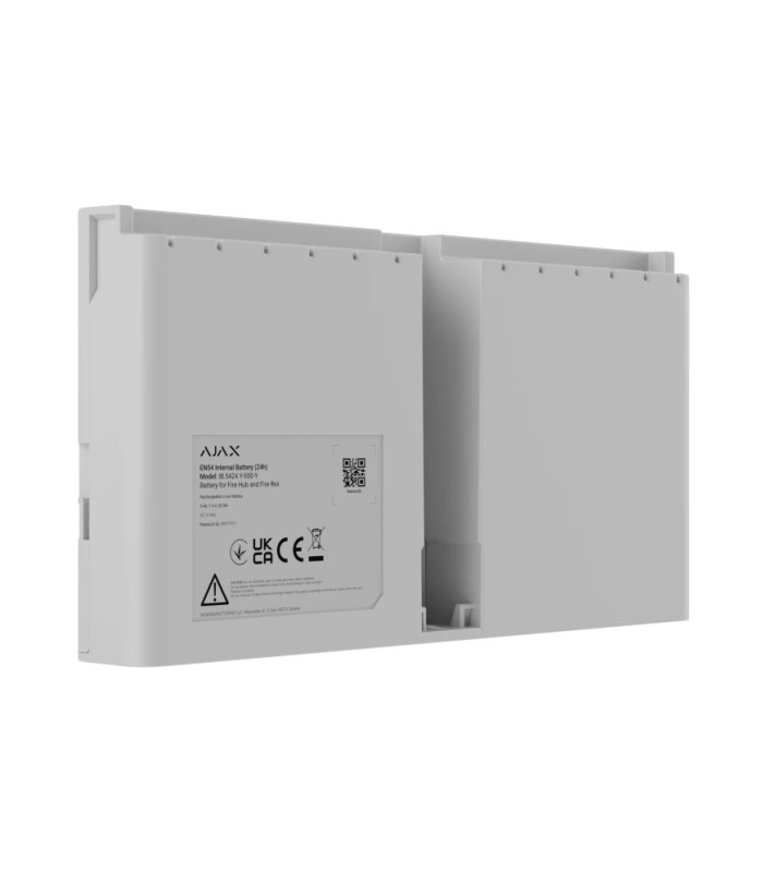 • EN54 Internal Battery (24h) — это литий-ионная батарея емкостью 5 А·ч, предназначенная для обеспечения автономной работы EN54 Fire Hub Jeweller или EN54 Fire ReX Jeweller до 24 часов. Соответствует стандартам EN 54 и совместима с пожарными системами Ajax.