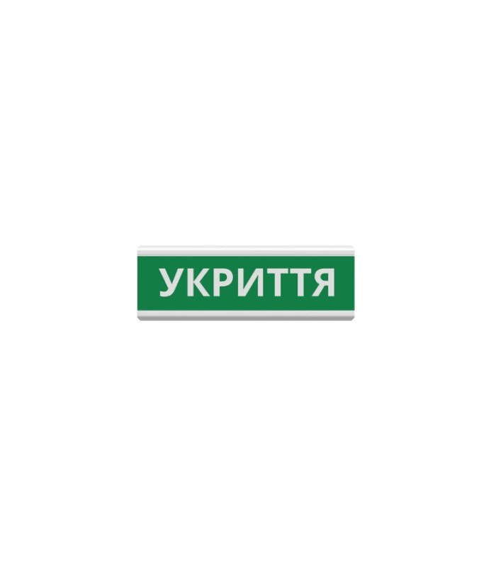 Оповещатель «Укриття» имеет эстетичный внешний вид и впишется в любой интерьер. Размеры корпуса: высота 11 см, ширина 30 см. Табло соответствует нормам и стандартам пожарной безопасности Украины.