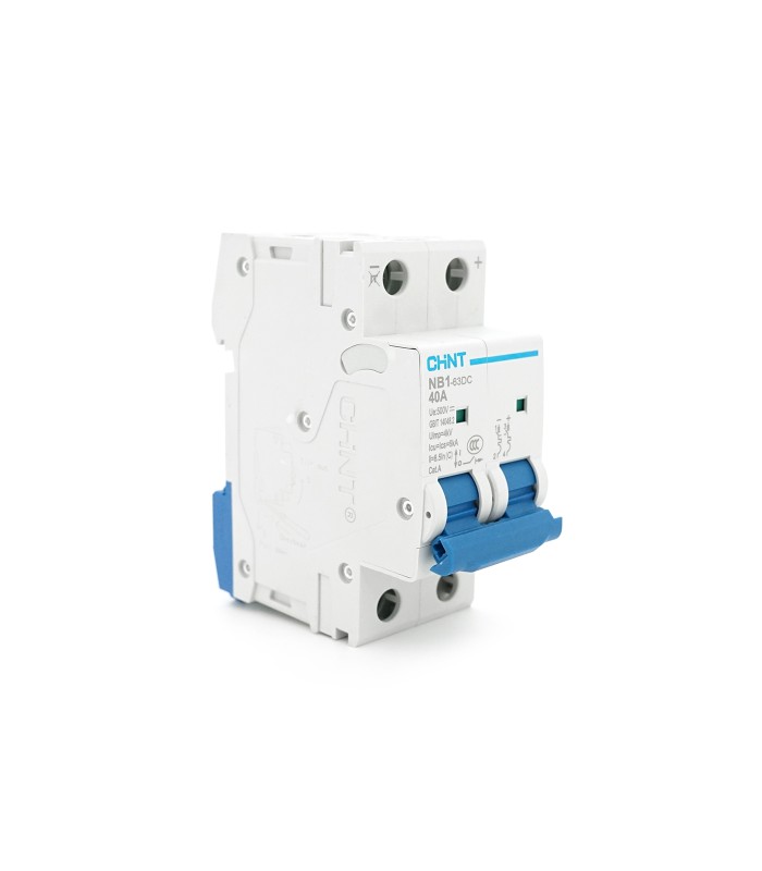 Двухполюсный автоматический выключатель серии NB1-63DC предназначен для защиты цепей постоянного тока от перегрузок и коротких замыканий. Устройство рассчитано на номинальный ток 40 А и напряжение до 500 В постоянного тока. Монтаж на стандартную DIN-рейку обеспечивает удобную установку в распределительные щиты и шкафы.