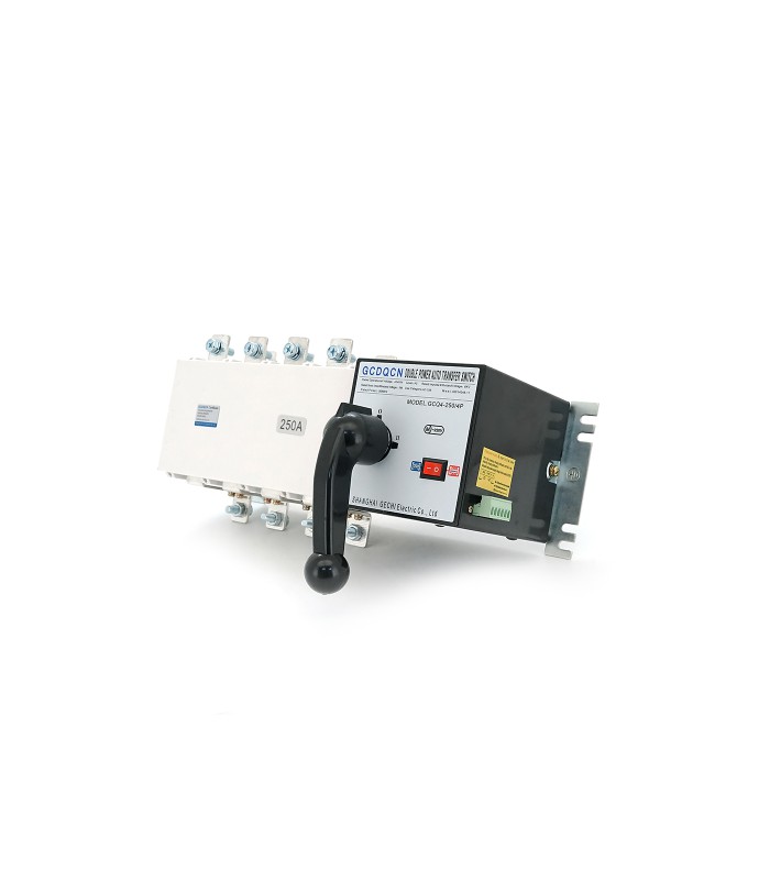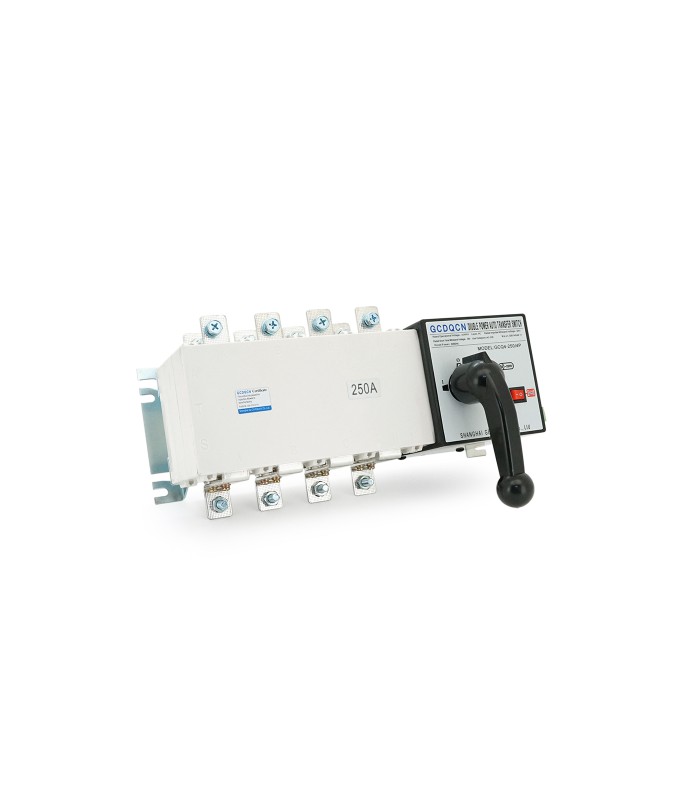 Автомат ввода резерва GCQ4P250A представляет собой четырехполюсное коммутационное устройство, предназначенное для автоматического переключения между основным и резервным источниками электропитания. Аппарат рассчитан на номинальное рабочее напряжение 220 В и номинальный ток 250 А. Компактный корпус размером 360×177×165 мм содержит все необходимые компоненты для надежной работы системы резервного питания. Устройство оснащено винтовыми клеммами для надежного подключения проводников.