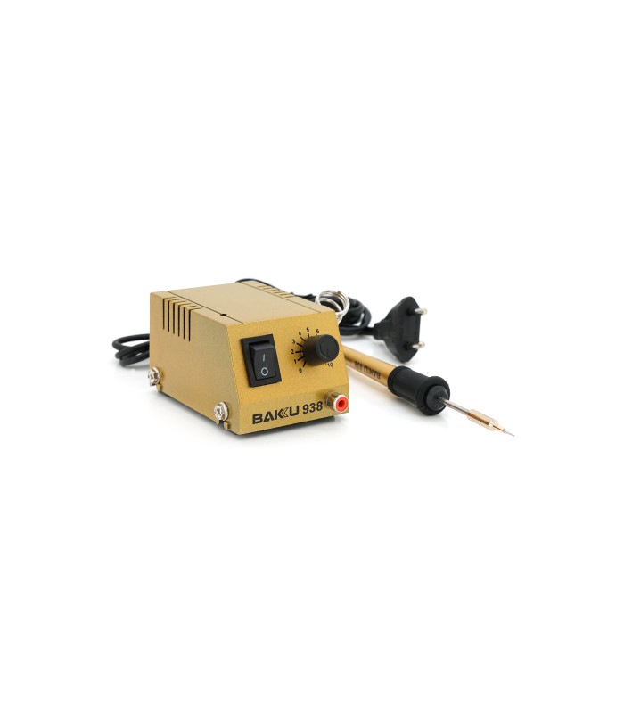 Паяльная станция BAKU BK938 – контактная паяльная станция, оборудованная паяльником с блоком регулировки. Максимальная температура жала паяльника 450°С достигается менее чем за минуту. На передней панели расположились клавиша питания, поворотный регулятор температуры, а также разъем для подключения паяльника. Регулировка температуры позволяет задействовать весь спектр припоев и флюсов. Компактность прибора делает его использование более комфортным.
