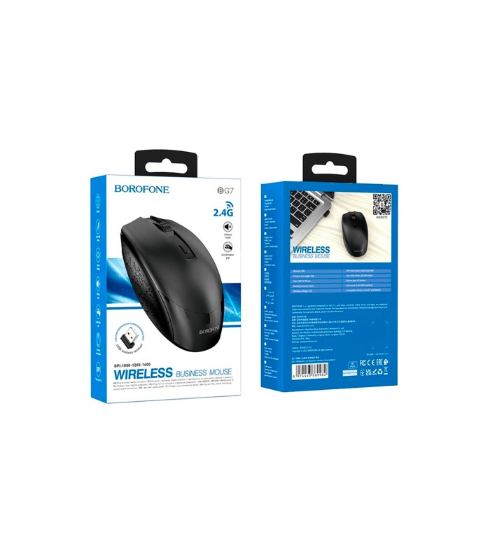 Беспроводная мышь BOROFONE BG7 с разрешением 1600DPI и черным цветом. Работает на частоте 2.4GHZ. Поставляется в удобной коробке.