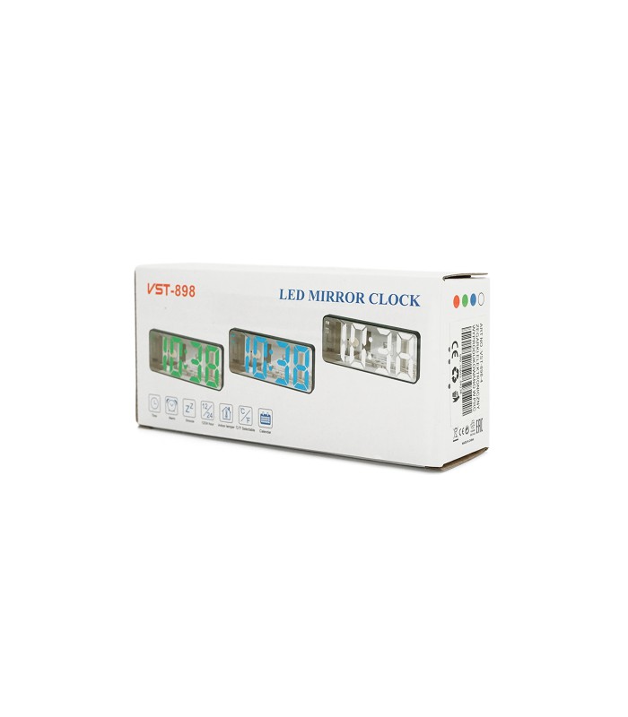 Электронные часы VST-898 с зеркальным дисплеем, датчиком температуры и влажности, будильником и питанием от кабеля USB, представлены в белом цвете.