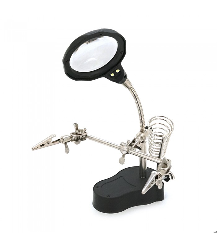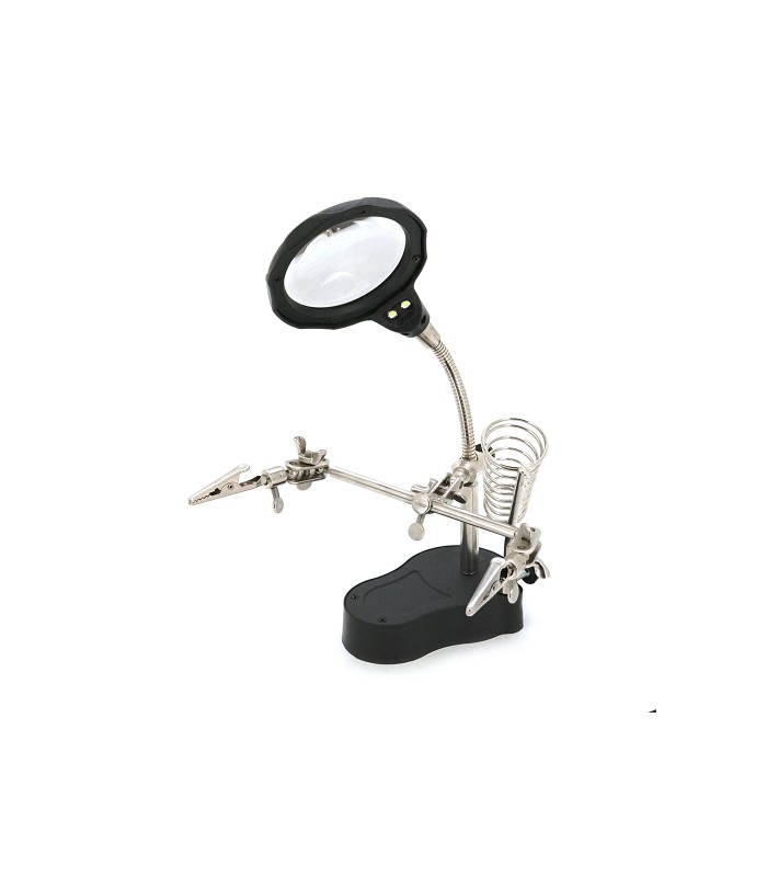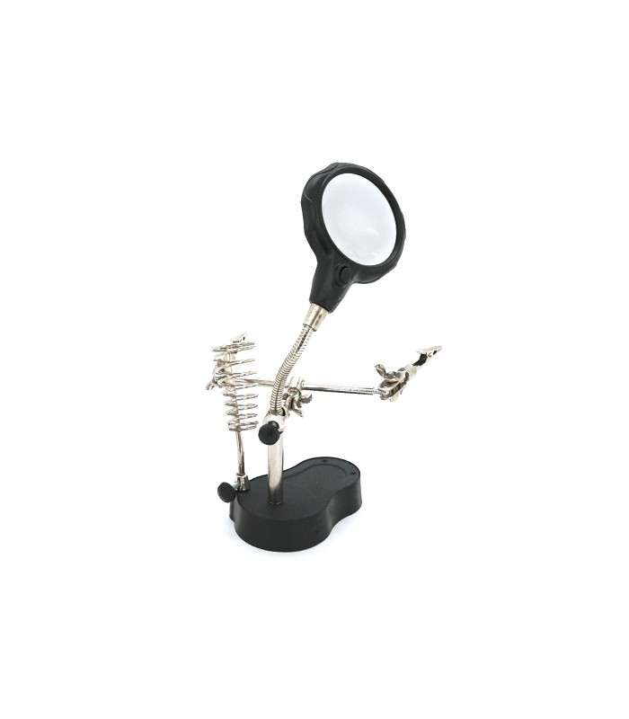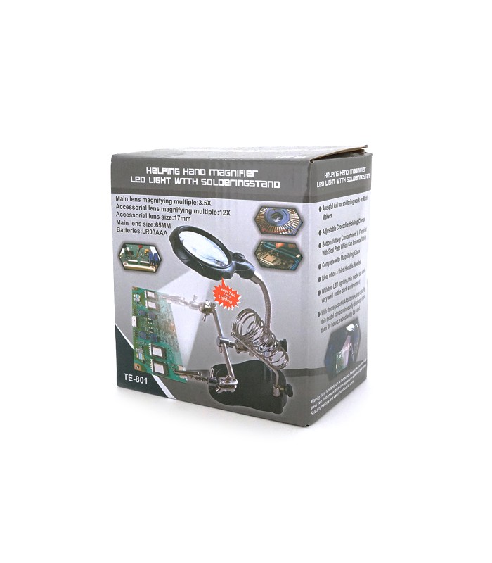 Держатель 'третья рука' TE-801 представляет собой компактное устройство, предназначенное для крепления и удержания различных предметов при выполнении мелких работ. Он обладает регулируемым диаметром 60 мм и обеспечивает увеличение в 3.5-12 раз, что делает его универсальным инструментом для различных задач.