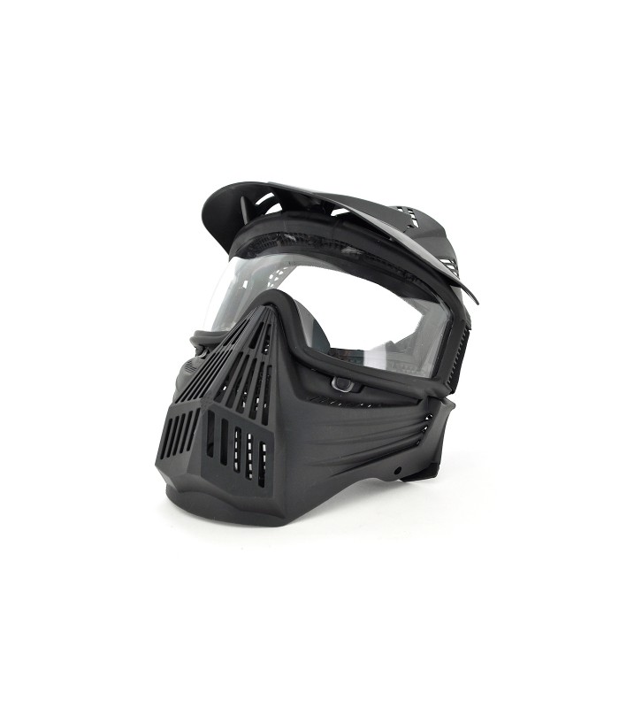 Защитная маска с козырьком предназначена для игры в пейнтбол и выполнена из черного пластика.