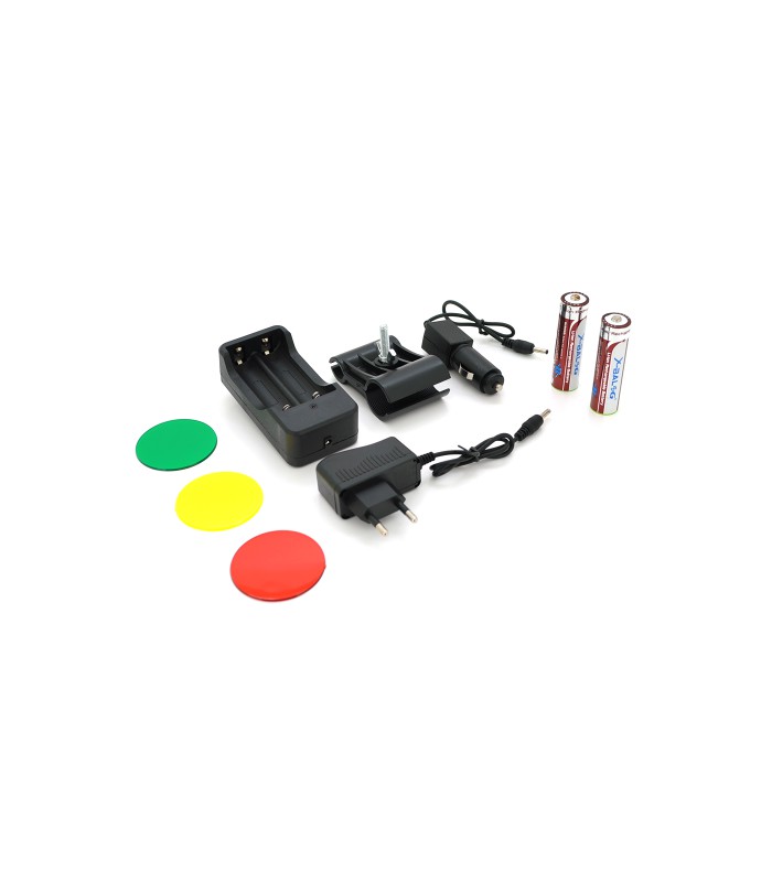 Комплектация: фонарь,2штуки аккумулятора, зарядное устройство для батарей 18650 2 слота, сетевое зарядное устройство, автомобильное зарядное устройство, подствольное крепление, набор стекол