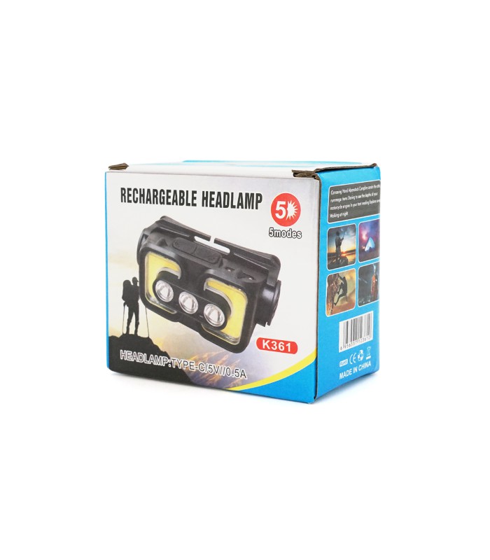 Налобный фонарик Voltronic K361 с ярким белым и красным светодиодом, 5 режимами освещения, водонепроницаемым корпусом, встроенным аккумулятором и USB Type-С кабелем.
