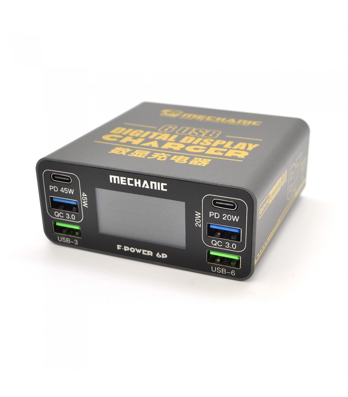 Зарядні станція з цифровою індикацією MECHANIC F-Power 6P, 2*PD3.1-5В3А, 9В3А, 12В3А, 15В3А, 20В2,25А, 2*QC-3.2*USB-A. 220V/87W.