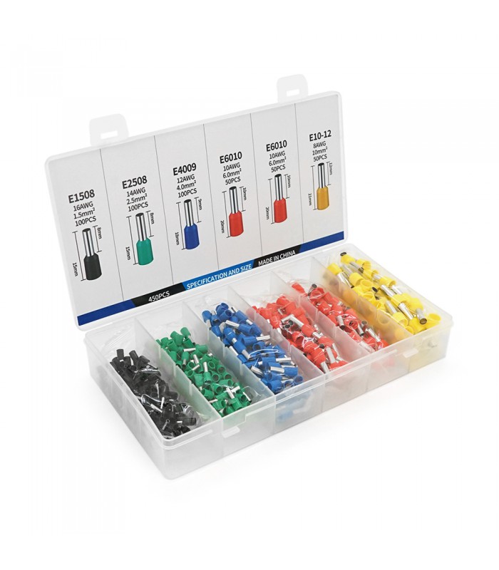 Набір клем/наконечників 450шт(E2508g-100,E1508bl-100,E4009b-100,E6010r-100,E1012y-50)в боксі Новинка