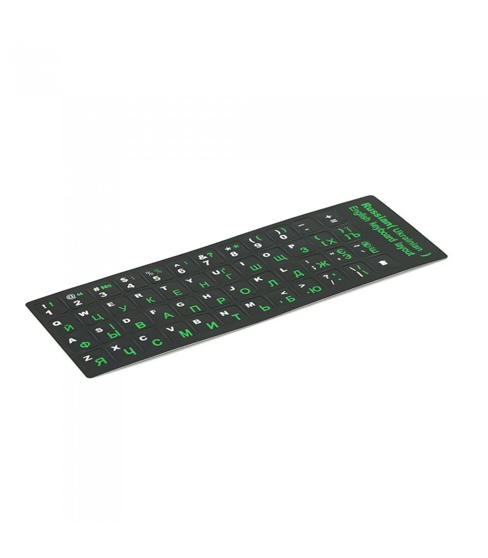 Це набір наклейок на клавіатуру, які мають чорний колір із зеленими літерами. Наклейки призначені для клавіатур з розкладками англійською, українською та російською мовами. Продукт має модельний номер Q500.