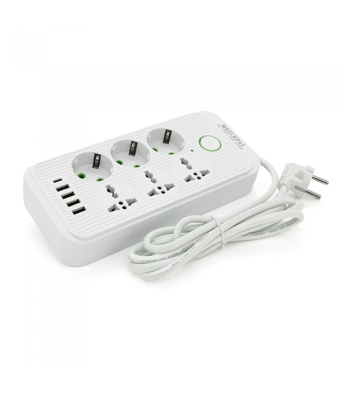 Фільтр F07U, 6 розеток (3 EU+3 Universal) + 4 USB + 1PD, кнопка включення з індикатором, 2 м, 3х0,75мм, 2500W, White, Box Новинка