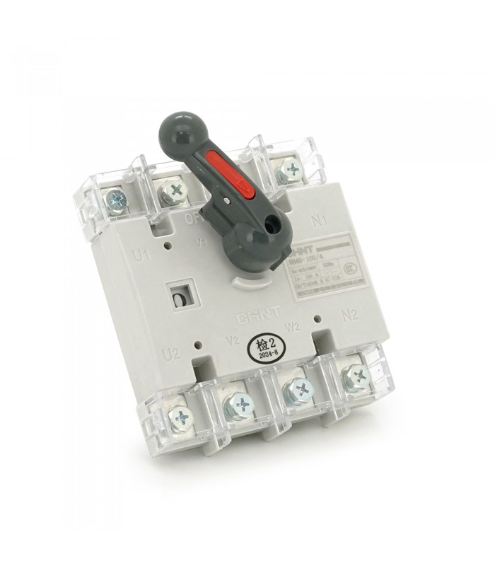 Ручний вимикач-роз'єднувач CHINT NH40-100/4P є чотириполюсним комутаційним пристроєм ручного управління, призначений для оперативного включення та відключення електричних ланцюгів під навантаженням. Пристрій розрахований на номінальну напругу 380V та струмове навантаження до 100A. Конструкція забезпечує видиму розривну відстань, що відповідає функції роз'єднувача. Модель оснащена стандартною рукояткою управління та призначена для монтажу у розподільних щитах промислового та комерційного призначення.
