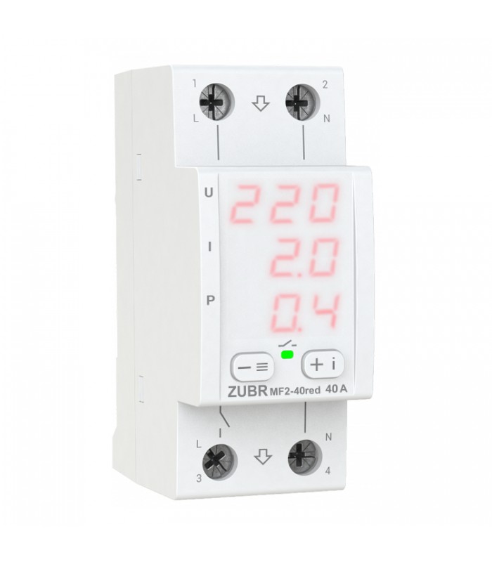 Реле MF2-40red захищає обладнання від високої та низької напруги, обриву нуля, а також обмежує споживання струму чи потужності.