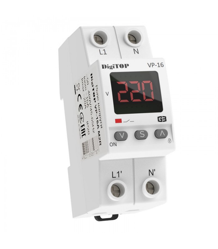 Захисне реле напруги однофазне VP-16A M2R з термозахистом на DIN-рейку, 16А, 3500Вт, 120-270В, двомодульне з індикатором напруги