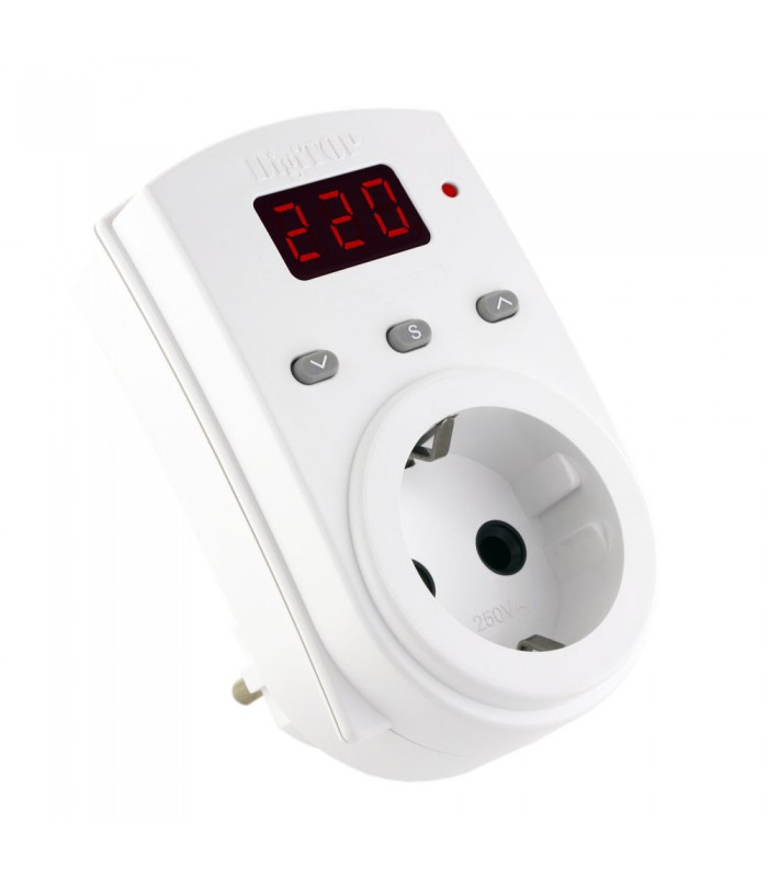 Пристрій постійно аналізує напругу в мережі та у разі виходу напруги за встановлені межі відбувається відключення підключених приладів.