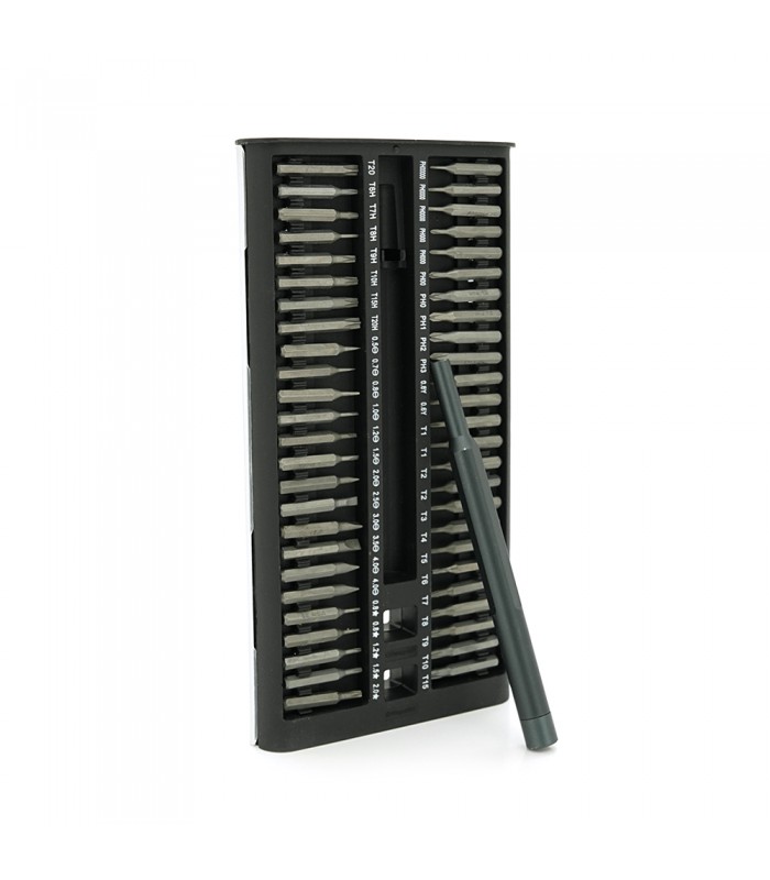 Цей набір включає двосторонню викрутку з бітами 102-in-1. Тримач має довжину 115 мм і виготовлений з алюмінію, а біти виготовлені з магнітного S2 матеріалу. Весь набір зручно зберігається у спеціальному боксі.