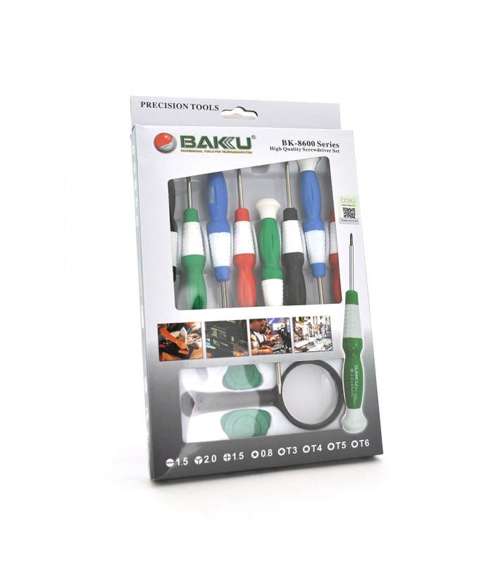 Набір інструментів BAKKU BK8600 (Викрутки: T3, T4, T5, T6, "мерс" 2.0, + 1.5, -1.5, * 1.5, 2 медіатора і лупа), Blister-box Новинка