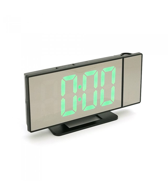 Електронний годинник VST-896 з дзеркальним дисплеєм, датчиком температури та вологості, функцією будильника та живленням від кабелю USB у зеленому кольорі.