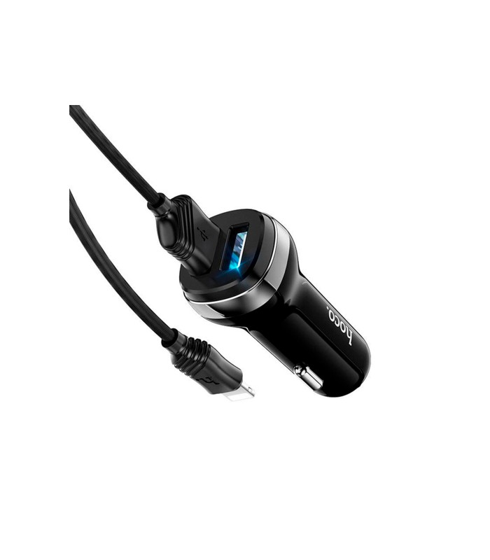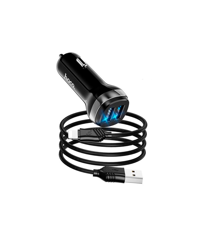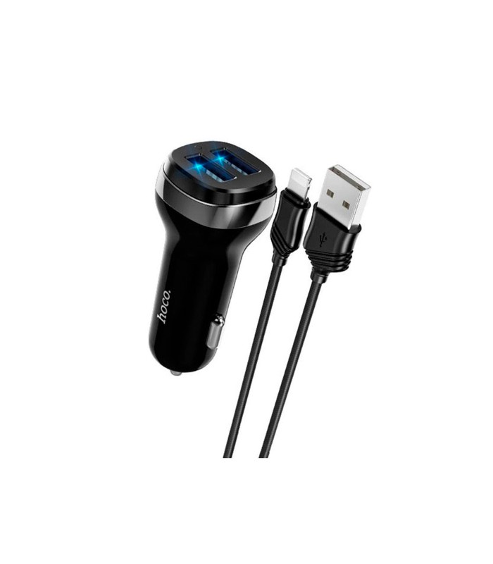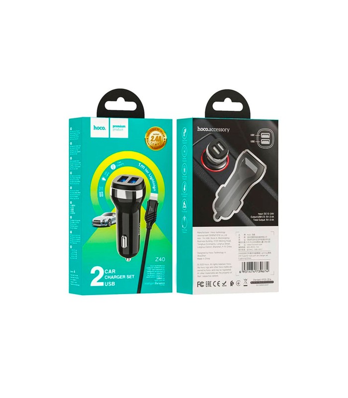 Набор зарядных устройств для автомобиля 12-24V HOCO Z40+ с кабелем Lighting, 2xUSB, 2.4A, длиной 1м, черного цвета, поставляется в коробке.
