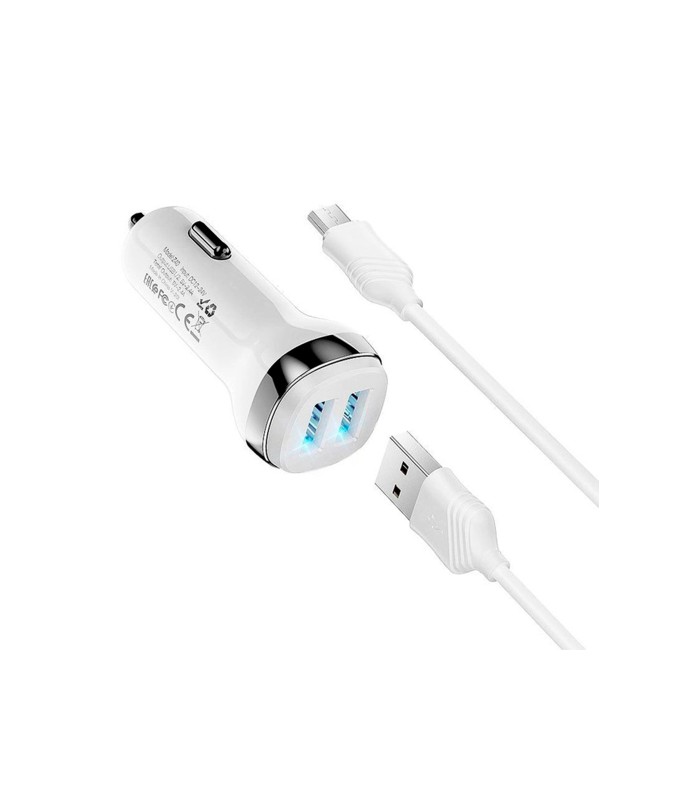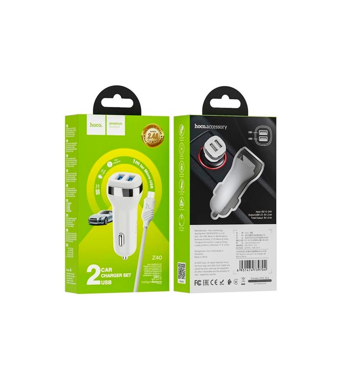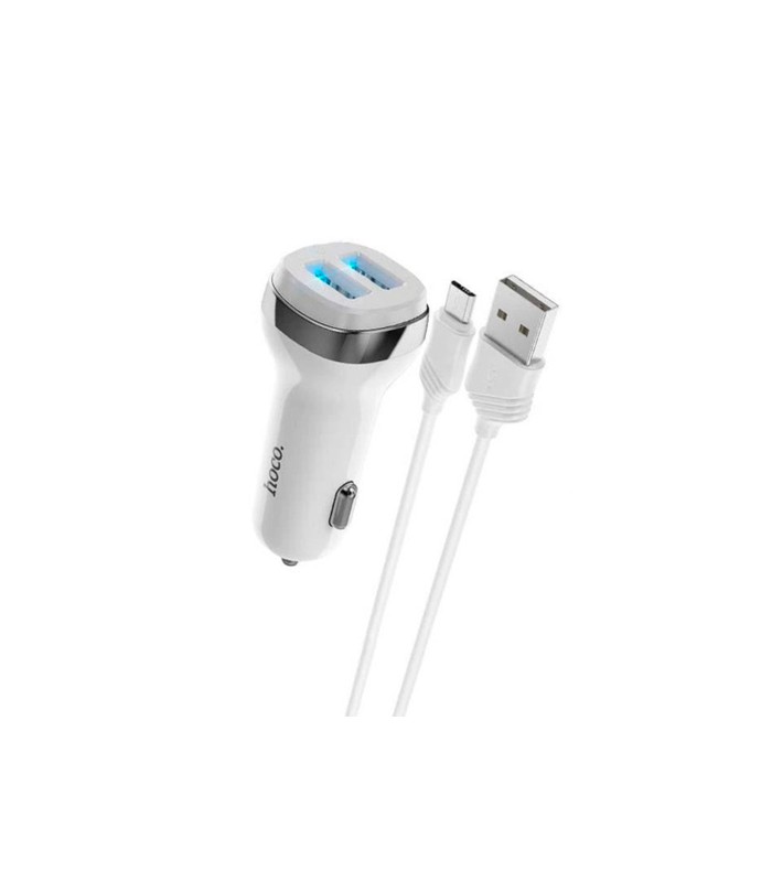 Набор зарядных устройств для автомобиля HOCO Z40+ с кабелем Micro, 2 разъема USB и выходом 2.4A. Длина кабеля 1м. Цвет - белый. Упаковка - коробка.