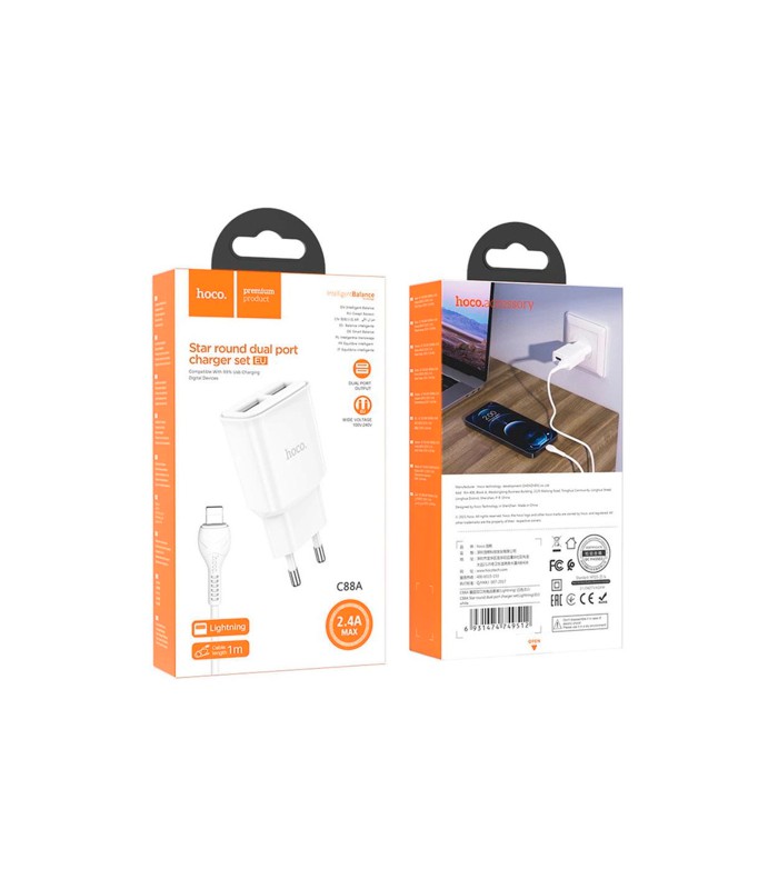 Этот набор включает в себя сетевое зарядное устройство с двумя портами USB и кабель Lightning. СЗУ обеспечивает выходной ток до 2.4A на каждом порту для быстрой зарядки устройств. Кабель Lightning длиной 1 метр также поддерживает ток до 2.4A и предназначен для зарядки и синхронизации совместимых устройств с разъемом Lightning. Упаковка в коробке обеспечивает надежную защиту при транспортировке и хранении.