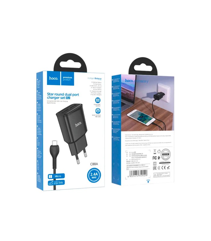 Этот набор включает в себя сетевое зарядное устройство с двумя портами USB и кабель Micro USB. СЗУ обеспечивает выходной ток до 2.4A на каждом порту для быстрой зарядки устройств. Кабель Micro USB длиной 1 метр также поддерживает ток до 2.4A и предназначен для зарядки и синхронизации совместимых устройств с разъемом Micro USB. Упаковка в коробке обеспечивает надежную защиту при транспортировке и хранении.