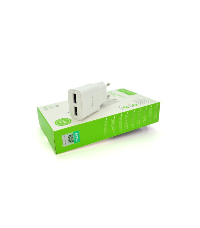 Сетевое зарядное устройство HOCO C88A с входным напряжением от 110 до 240 В,белого цвета, с двумя USB-портами, которые обеспечивают максимальную выходную мощность до 2.4A. Поставляется в белой коробке.