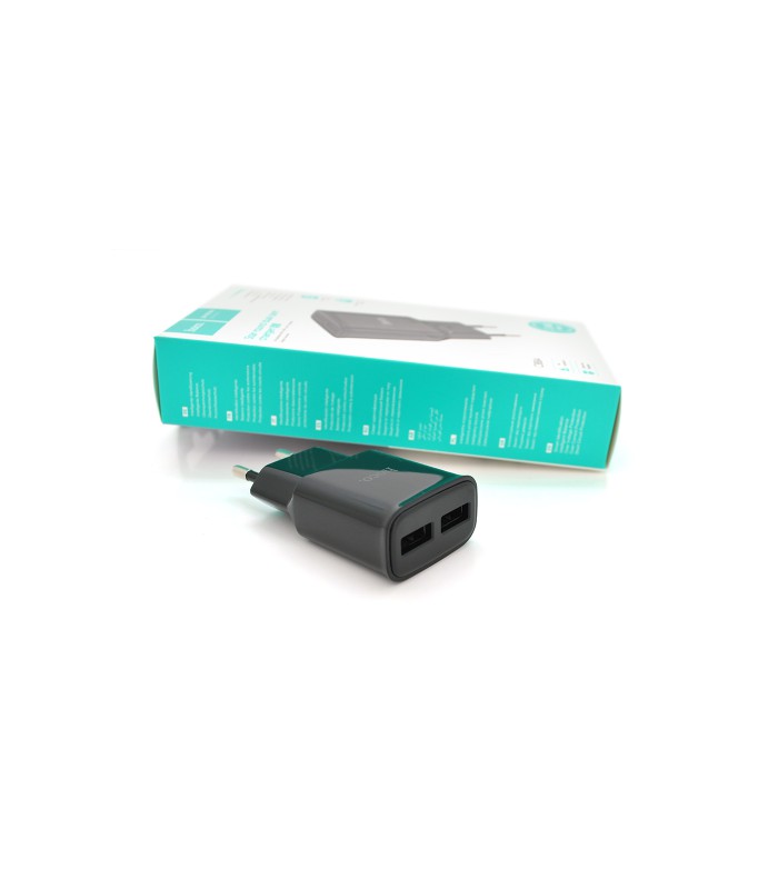 Имеет два порта USB и поддерживает максимальный ток 2.4A. Продукт упакован в коробку.