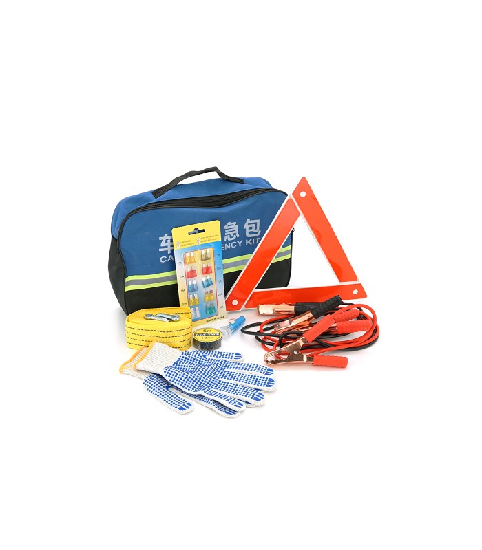Набор для автомобилиста, включающий в себя крокодилы, буксировочный трос, перчатки и подстилку, предназначенный для использования при нештатных ситуациях на дороге.