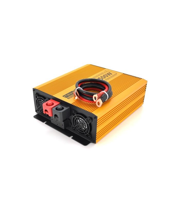 Инвертор напряжения MXSPSW-1500-12S - используется для преобразования электричества 12В в 220В. Позволяет подключать нагрузку до 1500Вт. На лицевой стороне устройства расположены две розетки, кнопка вкл/выкл, светодиоды. На обратной стороне устройства клемы для подключения проводов акб, вентилятор для активного охлаждения устройства, предохранители.