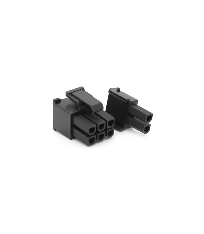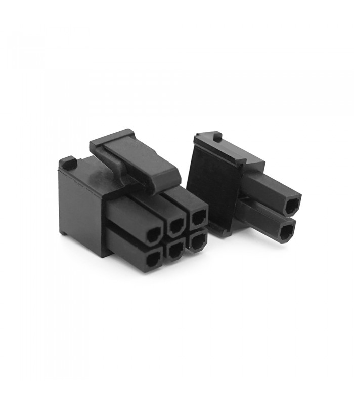 Разъем обеспечивает полное соединения с помощью фиксирующего механизма.Комплект из 6 и 2-контактных разъемов, а также самих контактов для создания 6+2(8)-контактного коннектора питания соответствующих PCI Express видеокарт.