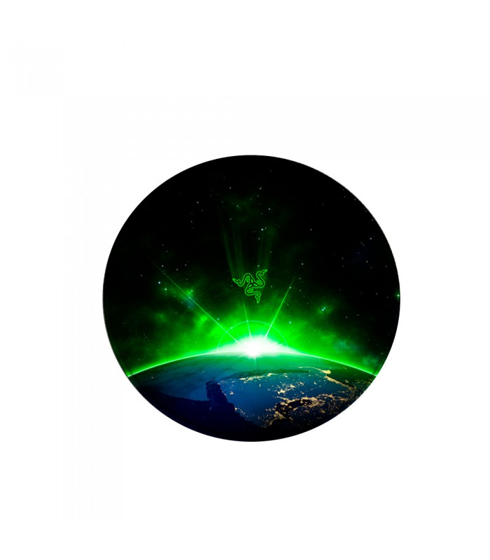 Тканинний килимок RAZER з боковою прошивкою, круглої форми, призначений для комп'ютерної миші. Має товщину 3 мм та розмір 220*220 мм. Колір - чорний із зеленими акцентами.