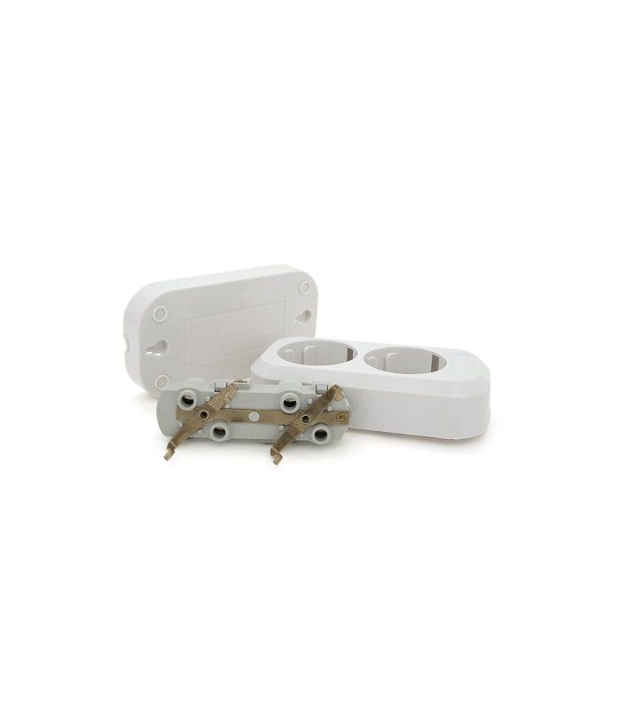 2 гнезда с заземлением. Работает при напряжении 250В и токе 16А, обеспечивая стабильность и безопасность подключаемых устройств.