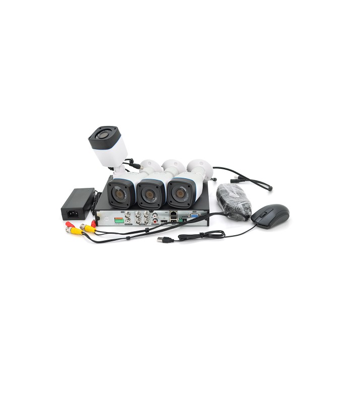 Комплект для самостоятельной установки в который входит 4 уличные камеры разрешения 5 мегапикселей , Мультиформатны видеорегистратор с поддержкой камер высокого разрешения и IP . Импульсный источник питания , и кабеля для подключения камер к видеорегистратору по 18 метров .