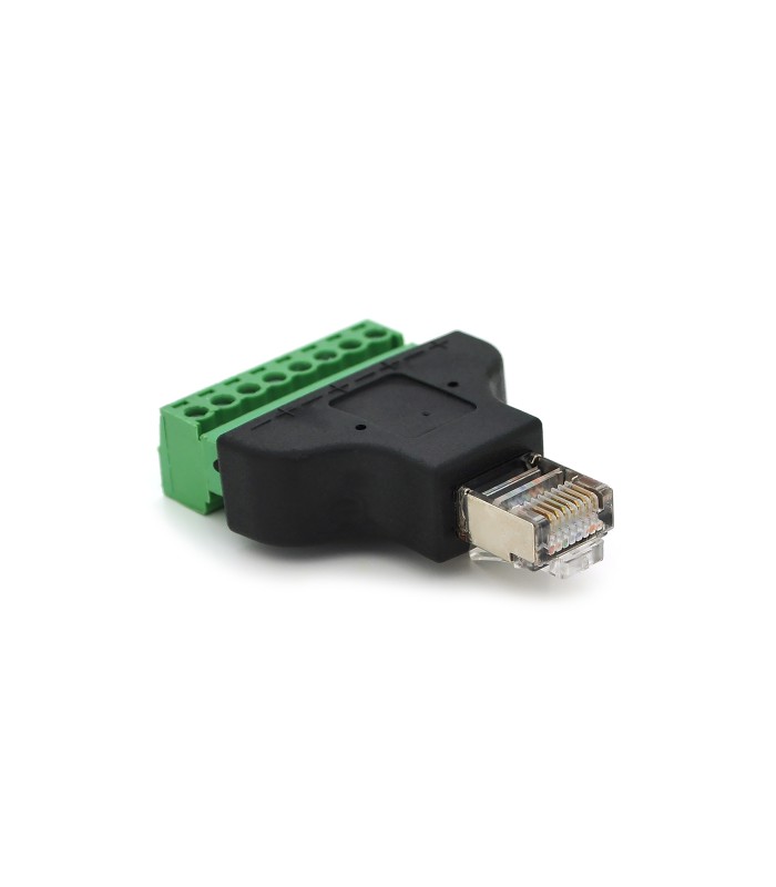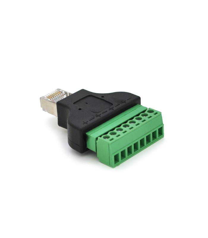 Клеммная колодка 8-разрядная Клеммная колодка 8-разрядная + RJ45 8P8С папа - переходник для передачи сигнала с помощью витой пары между устройствами, у одного из которых нет разъема RJ45.