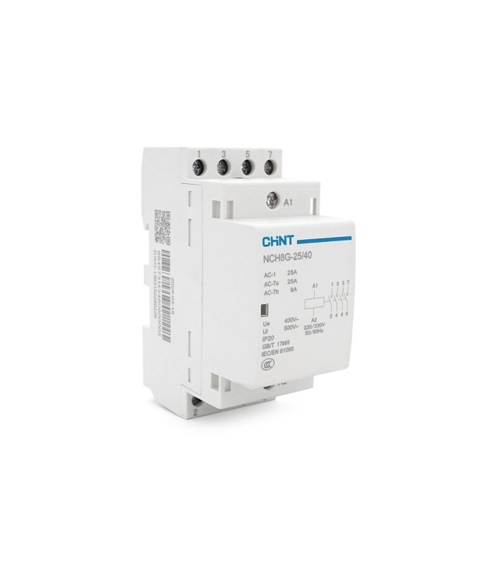 Мощный четырехполюсный контактор для управления силовыми цепями переменного тока. Устройство предназначено для дистанционного включения и отключения нагрузок с помощью стандартного напряжения управления 220 В. Контактор монтируется на стандартную DIN-рейку в распределительный щит, что обеспечивает простоту установки и компактное размещение в электрощитовом оборудовании.
