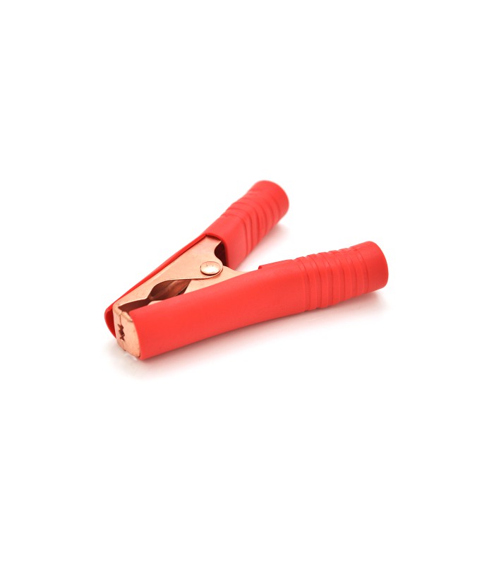 Зажим аккумуляторный 'крокодил' красного цвета с номинальным током до 100 А и длиной 90 мм представляет собой удобный и надежный способ соединения проводов с аккумуляторами или другими источниками электропитания. Вот основные характеристики и описание: