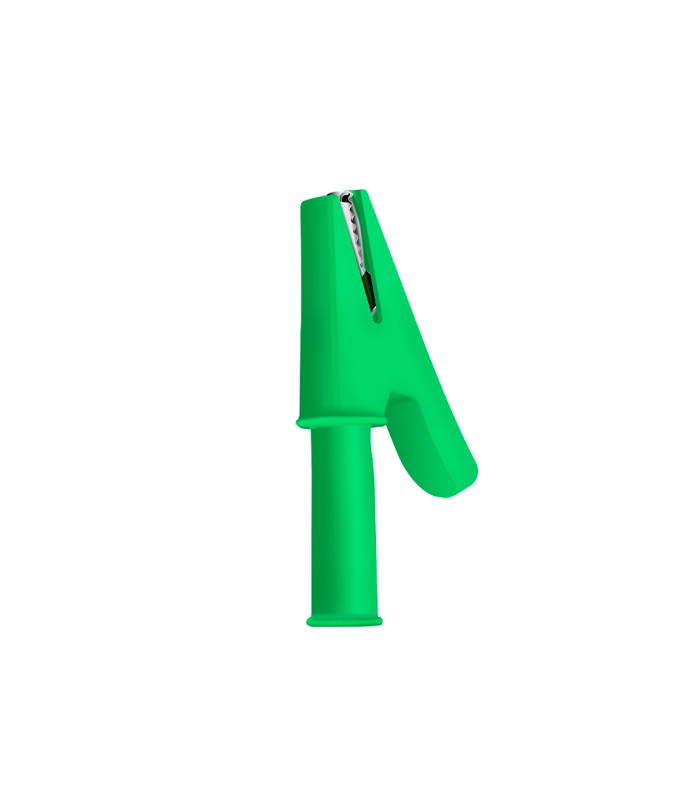 Тестовый зажим 'крокодил' зеленого цвета с эластичным резиновым кожухом, размером 56 мм и номинальным током 30А.