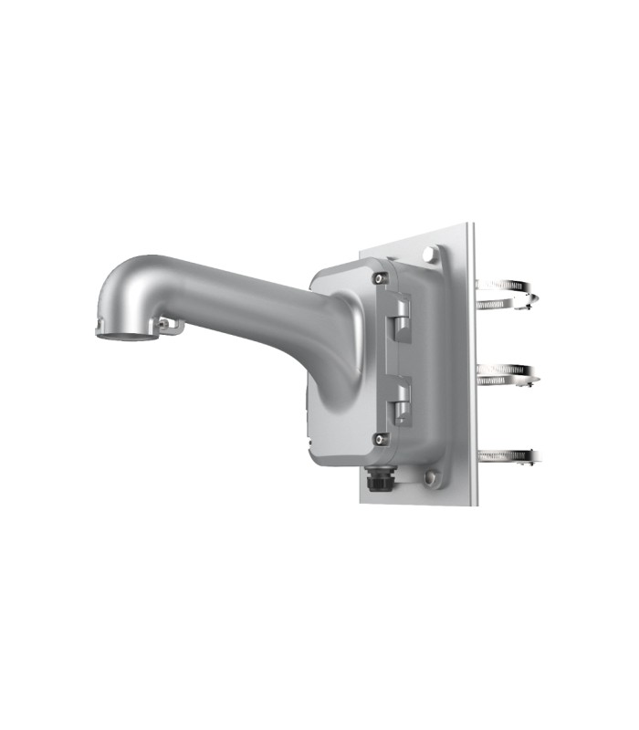 DS-1604ZJ-BOX — надежное и функциональное крепление, позволяющее установить видеокамеру формата PTZ на столбе. Имеет вертикальное крепление и встроенную распределительную коробку для проводки. Монтируется на столбах, с помощью стальных хомутиков. Ширина охвата должна быть в пределах 100-200мм. Кронштейн выполнен из алюминия. Состоит из площадки, открывающегося коммутационного бокса и ручки для камеры. Имеет стандартный крепеж для панорамных устройств. Также присутствует страховочный крючок для большей безопасности техники. Рассчитанный вес устанавливаемого оборудования — до 10кг. 1604ZJ-BOX-POLE-P, за счет внушительной распредкоробки, предполагает эстетичное и защищенное размещение внутри адаптера питания. Провода выводятся по предусмотренной трубке в ручке.