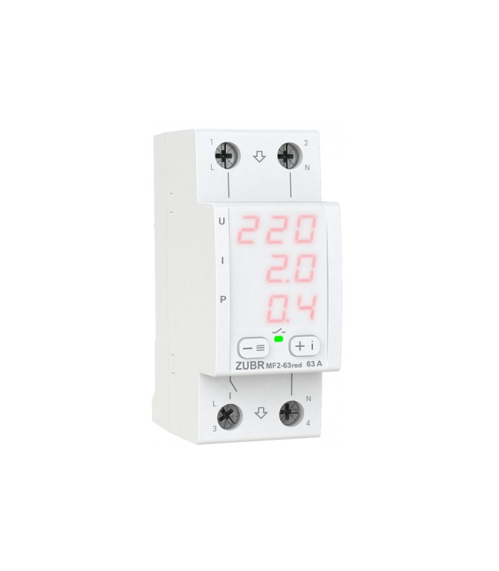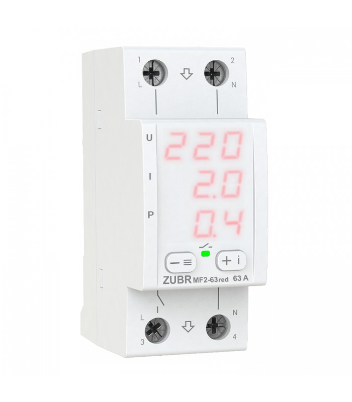 Реле MF2-63red защищает оборудование от высокого и низкого напряжения, обрыва нуля, а также ограничивает потребление тока или мощности.