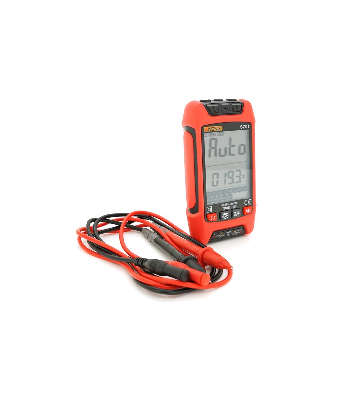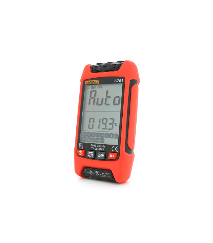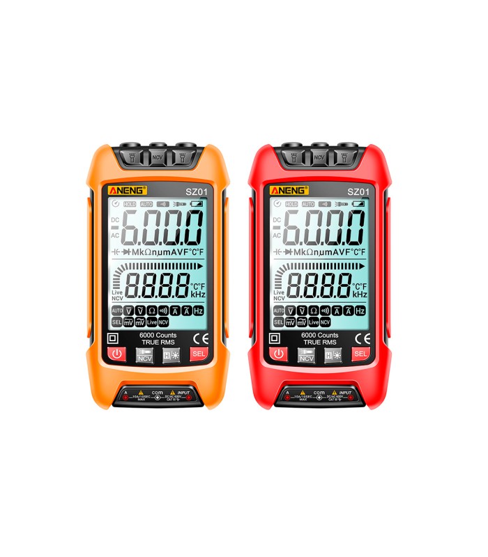 ANENG SZ01 - это портативный цифровой мультиметр с автоматическим выбором диапазона и истинным среднеквадратичным значением с питанием от батарей и большим ЖК-дисплеем на 6000 отсчетов. Мультиметр позволяет измерять в автоматическом режиме напряжение, силу тока, сопротивление, частоту, а также имеет встроенный NCV тестер и функцию определения фазного и нулевого проводников.
