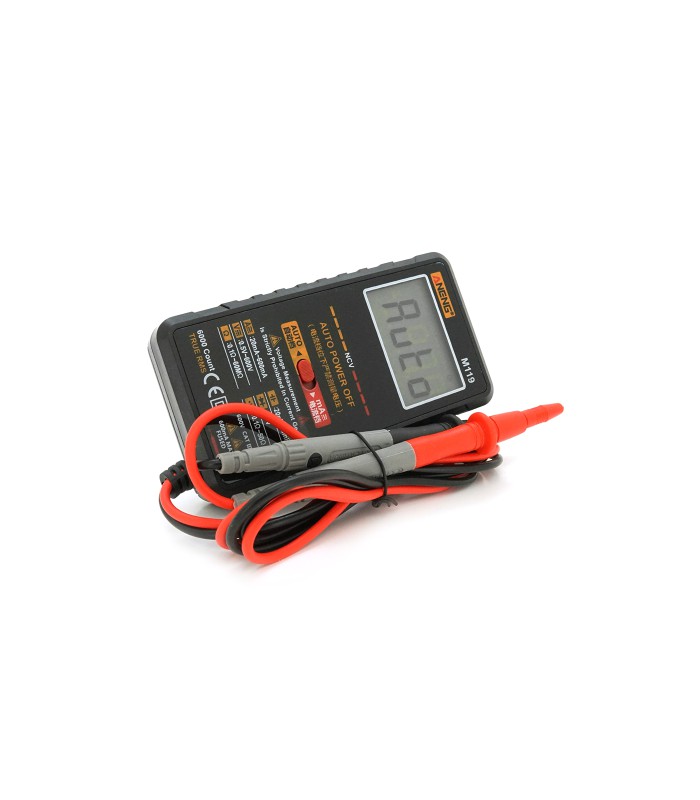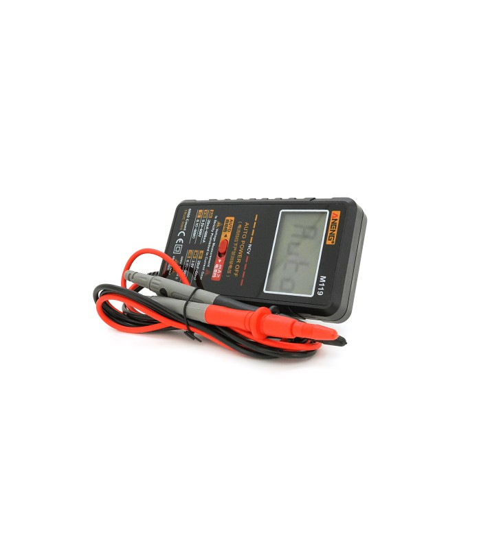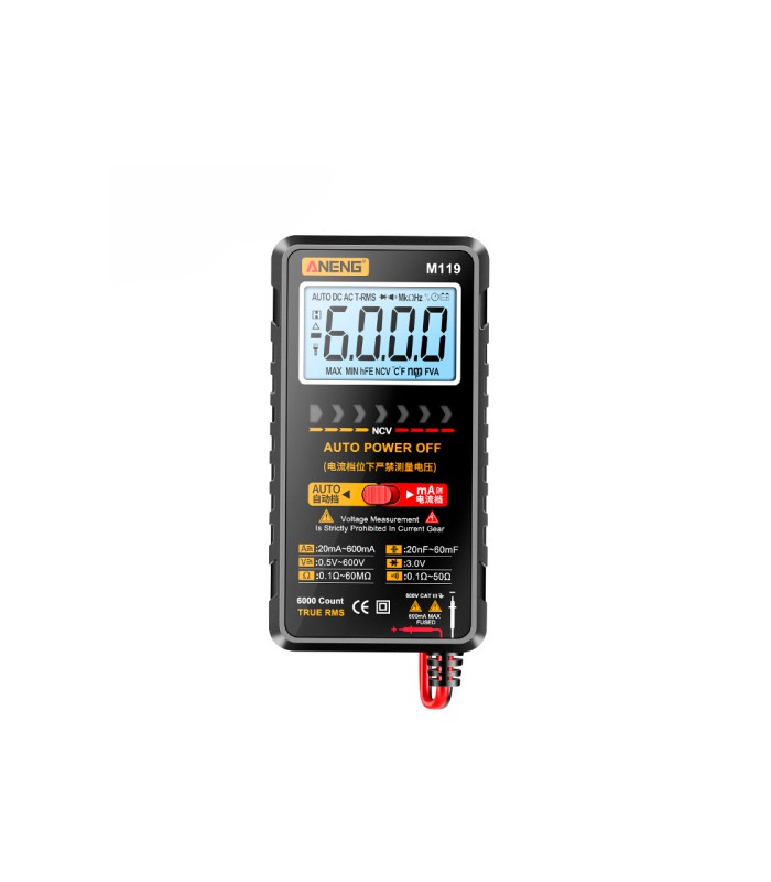 Компактный цифровой мультиметр ANENG M119 – прибор для измерения электрических параметров при диагностике и ремонте различной электроники. Данный цифровой мультиметр имеет технологию измерения True RMS, автоматически находит измеряемую величину и подбирает необходимый диапазон (DC/AC напряжение, DC/AC ток, электрические емкость и сопротивление). Также прибор имеет функции: проверки диодов, звуковую прозвонку цепи, NCV тестера и определение фазного/нулевого проводника. Результаты измерений отображаются на большом ЖК-дисплее, при работе в условиях слабого освещения прибор оснащен подсветкой дисплея и фонариком.