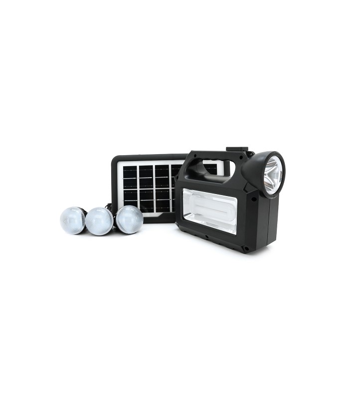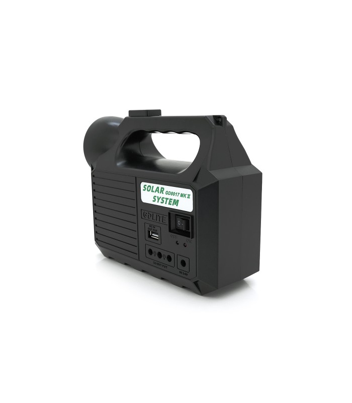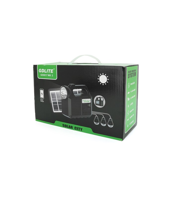 Описание на русском: Переносной солнечный фонарь GD-8017+ с 1+1 режимом, встроенным аккумулятором, 3 лампочками по 3W, USB выходом, черного цвета, поставляется в коробке.