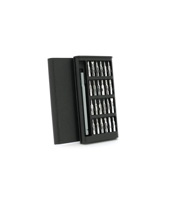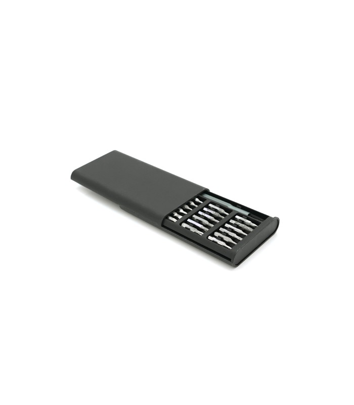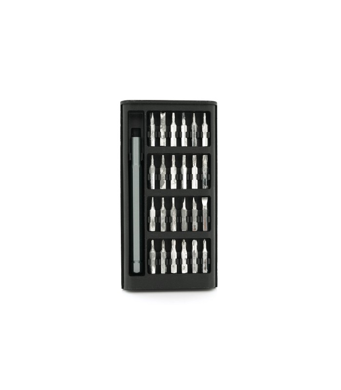 Этот набор включает в себя отвертку с 24-мя битами различных размеров. Длина держателя составляет 88 мм, а биты изготовлены из устойчивого к износу материала S2. Ручка выполнена из алюминия для дополнительной прочности и удобства использования. Весь набор удобно хранится в специальном ящике.