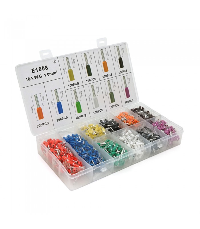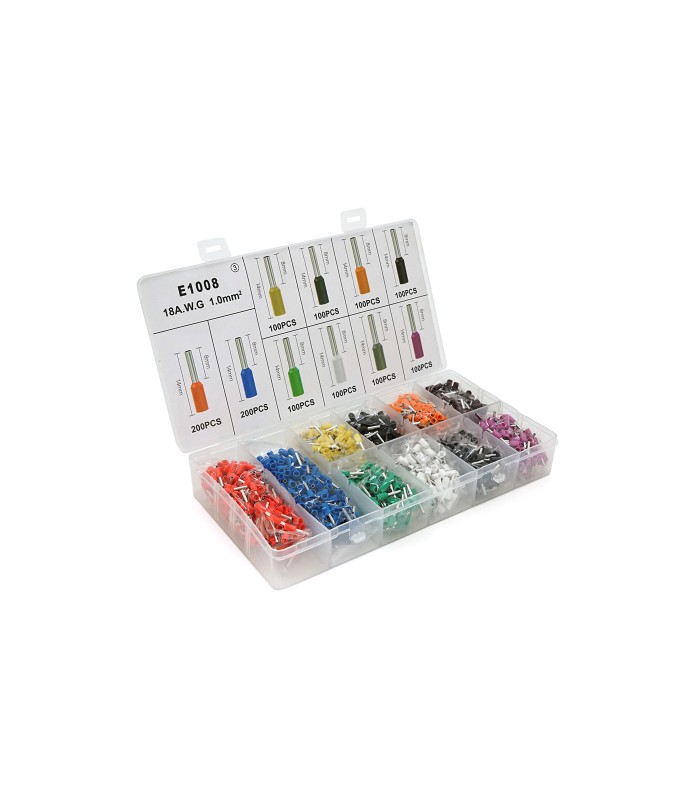 Набор клемм/наконечников 1200шт E1008 (R-200, B-200, Y-100, Bl-100, O-100, Br-100, G-100, W-100, Gr-100, V-100) в боксе