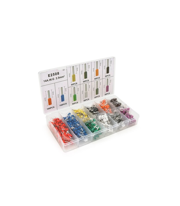Набор клемм/наконечников 600шт VE2508 (R-100, B-100, Y-50, Bl-50, O-50, P-50, G-50, W-50, Gr-50, V-50) в боксе