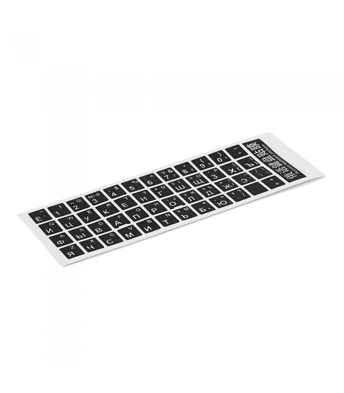 Наклейки на клавіатуру чорного кольору з білими літерами призначені для зручності використання клавіатури з можливістю перемикання між російською та англійською мовами.