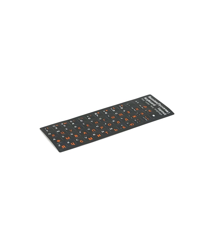 Набор наклеек на клавиатуру, черного цвета, с белыми английскими буквами и оранжевыми русскими буквами.