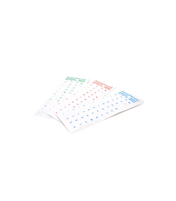 Прозрачные наклейки на клавиатуру с красными буквами Рус. для удобства набора текста на русском языке.