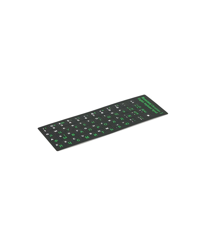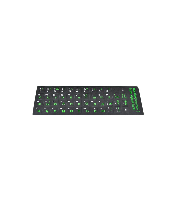 Это набор наклеек на клавиатуру, которые имеют черный цвет с зелеными буквами. Наклейки предназначены для клавиатур с раскладками на английском, украинском и русском языках. Продукт имеет модельный номер Q500.